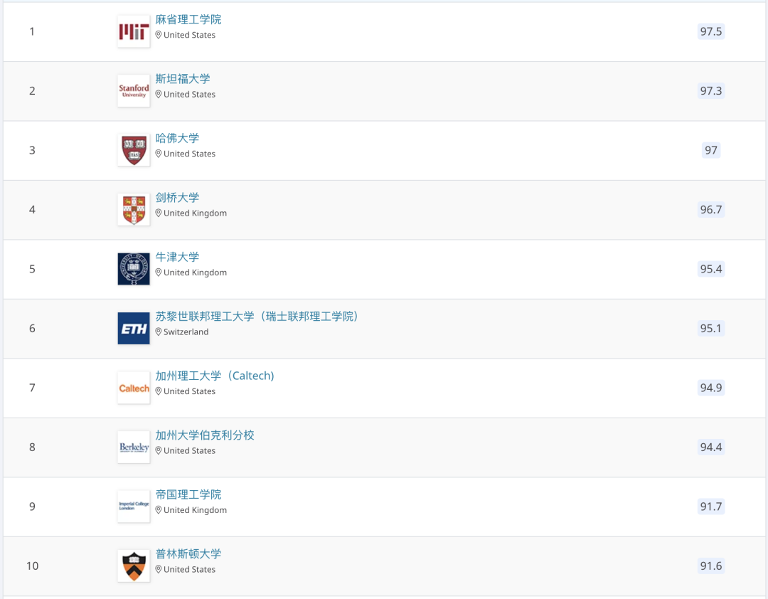 美國依舊占據榜單前列最多名額,麻省理工和哈佛大學位居榜首,在12個學科排名全球第一