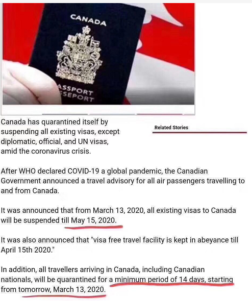 3月16日加拿大總理特魯多向全國發表講話,宣布遏制新冠肺COVID-19疫情擴散的最新措施-即加拿大將從3月18日起限制入境,絕大多數簽證暫時失效!!3月18日至5月15日所有持有加拿大簽證的外國護照(除外交類)均不能入境加拿大!加拿大免簽國家則是禁止入境直至4月15日!任何人,進入加拿大均需隔離14天!