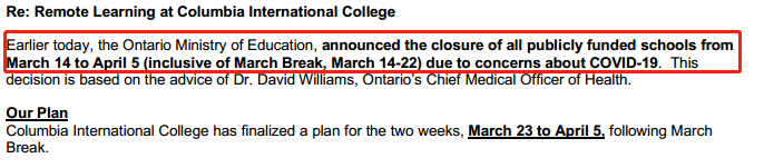 隨著疫情的擴散,加拿大學校已經全面停課直至4月5日(根據不同的學校時間會有不同)。為了不耽誤學生的學習進度,學校將會于3月中下旬陸續開放網課,學生必須按時登陸并繼續目前課程(停課不停學)。