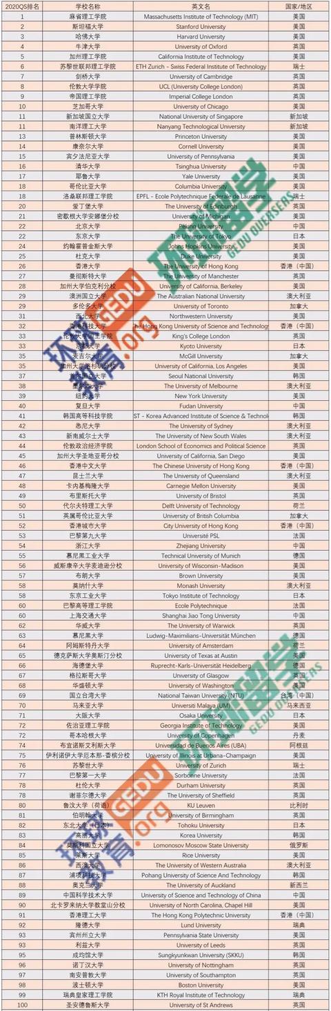 2020 QS 世界大學(xué)排名TOP200 榜單-中文版本