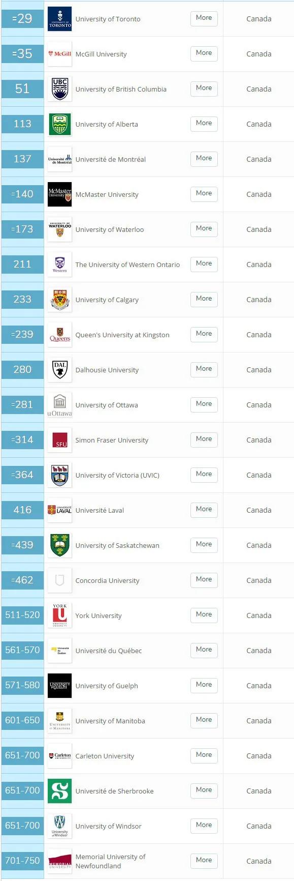 2020 QS 加拿大排名 TOP 25