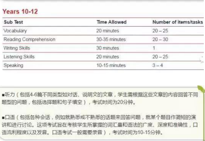 包括詞匯、閱讀理解、寫作、聽力以及口語,形式則多種多樣,單選、多選、句子填空、詞語配對、圖表等等一系列的考試形式,相較于中國比較刻板、死記硬背的傳統(tǒng)考試方式來說更全面的考察了孩子們應(yīng)該具備的英語素養(yǎng)和舉一反三的能力。