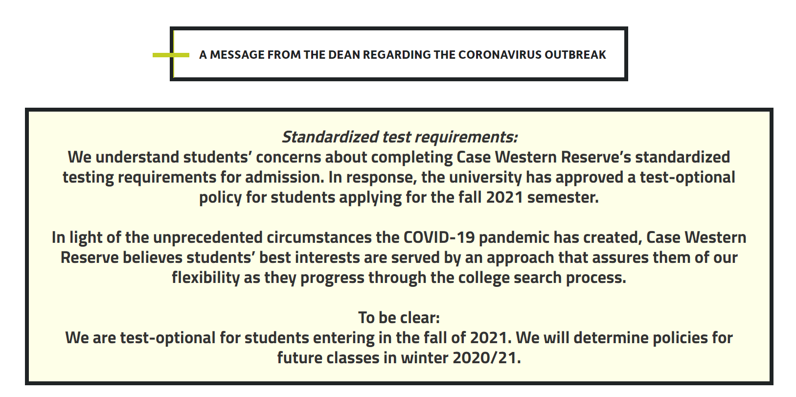 3月18日,凱斯西儲大學(CWRU)在其官網上發布了一條重要通知:考慮到現實情況,學校決定對申請2021年秋季入學的學生采取test-optional政策。這就意味著,CWRU今年將不再強制要求申請者提供SAT/ACT成績。
