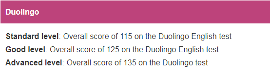 UCL認可的語言成績還包括多鄰國(DET)成績: