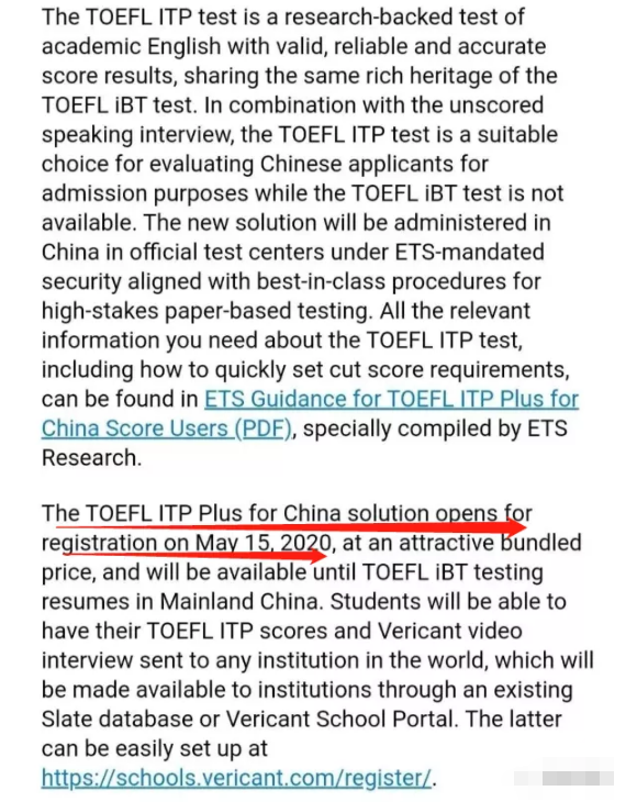 TOEFLITPPlusforChina,中國特供版托福考試,臨時替代TOEFLiBT,僅在iBT無法復考期間在中國大陸開展。TOEFLITPPlus將在正規考點進行,是紙筆測試而非機考。