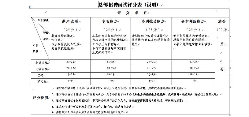 500強央企國企面試評分標準(舉例)