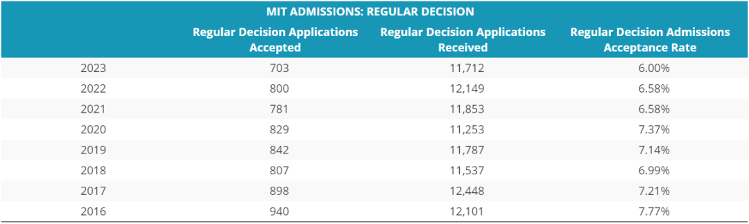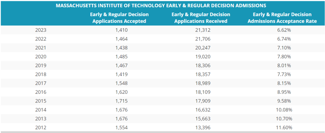 要說MIT有多嚴格,從早申錄取率就能看出來,別的學校都是常規錄取5%以下,早申都在10%以上。然而MIT的早申和常規申請錄取率都差不多,從2017屆開始,連續8年,兩種錄取率均低于10%。