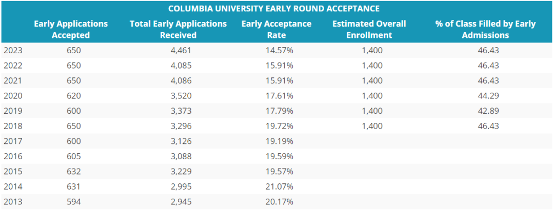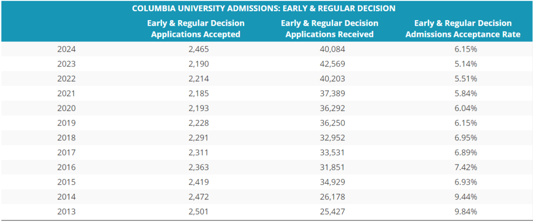 歷年來,哥大的錄取率著實低,近幾年一直處在8%以下,跟哈佛、耶魯、普林斯頓差不多。哥大的早申錄取率近幾年也下降的格外明顯,好在今年錄取率上升。