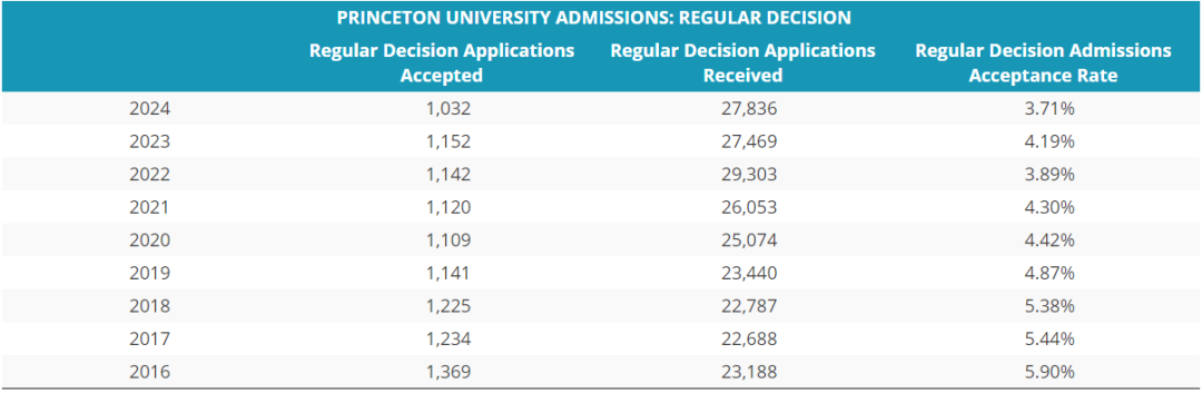 與所有頂級學校的趨勢相似,普林斯頓大學的錄取率在過去幾年中持續下滑,連續11年錄取率低于10%。