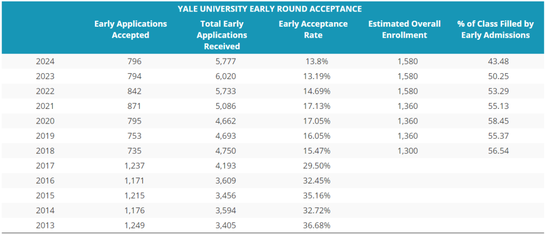 在2012年之前,耶魯的早申錄取率還是挺高的。但從13年之后,錄取率大幅下降,從35%降到了如今的13.8%。