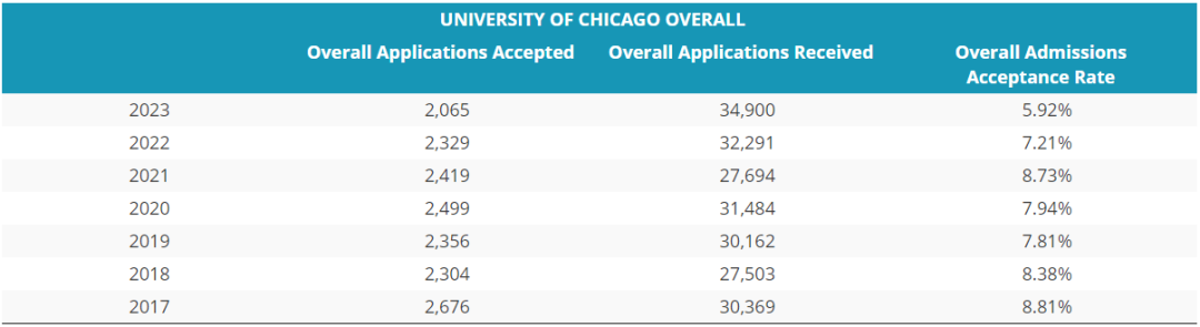 去年,芝大算是創造了歷史新低。近幾年,芝大的錄取標準一再提高,因而導致不少同學望而卻步,這一趨勢在申請人數上不難看出。