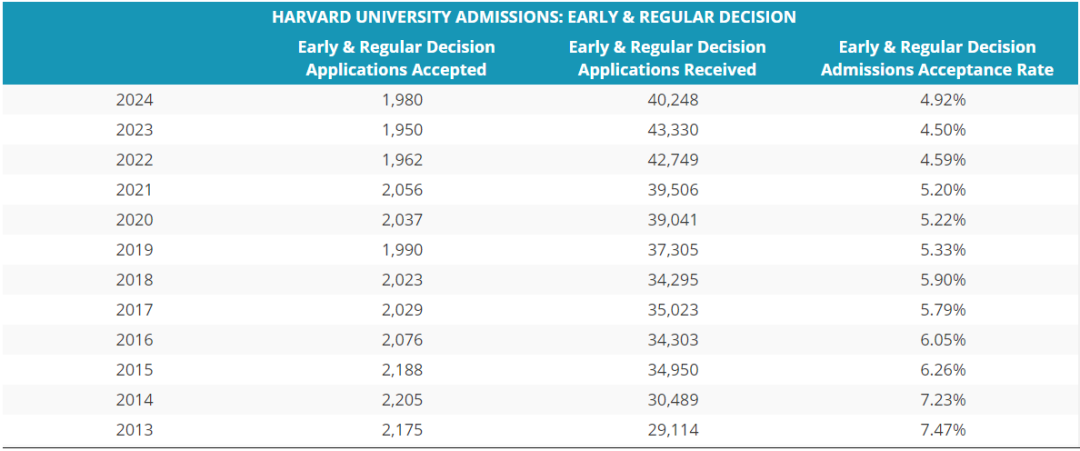 事實上,哈佛的早申錄取率還是比較高的,到目前為止,起碼每年都還在13%以上。