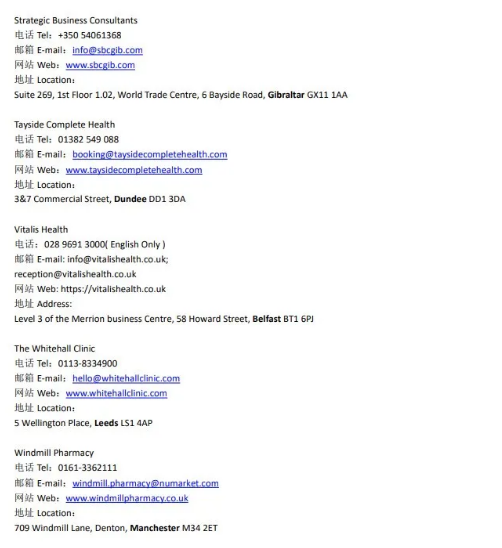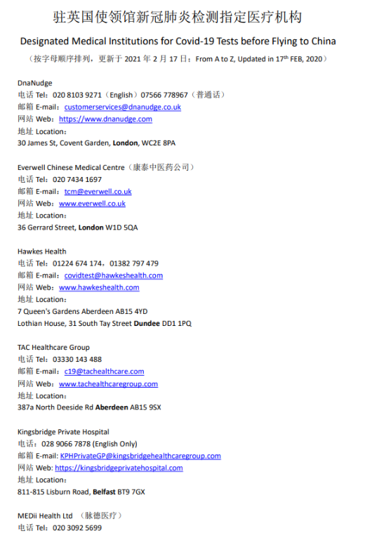 (六)中國駐英國使館將根據工作需要對指定機構名單進行動態調整,請赴華人員在預約檢測當天登陸使館網站查閱最新指定機構名單,以免因選擇了非指定檢測機構而影響行程。