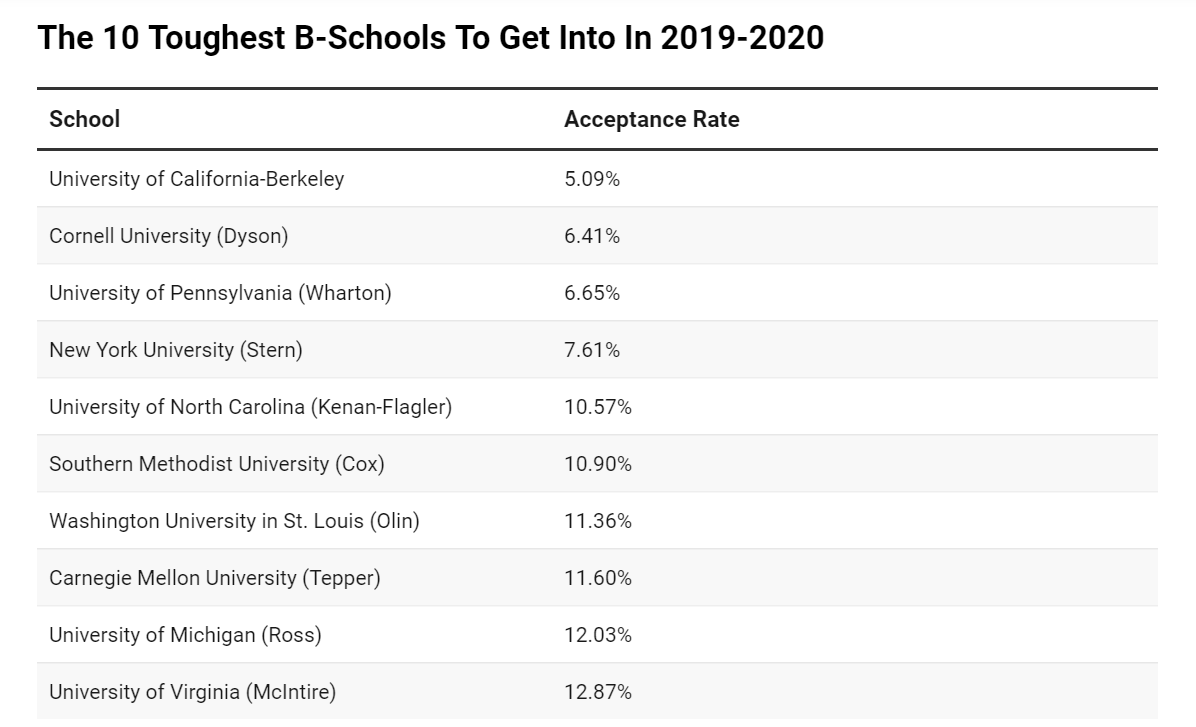 首先從整體上看,美國眾多頂級商學院的錄取率并不高。對于2019年秋季入學的學生,錄取率最低的學校是加州大學伯克利分校的哈斯商學院(HaasSchoolofBusiness),僅為5.09%。康奈爾大學的戴森學院(DysonSchool)緊隨其后,錄取率只有6.41%。同時,賓夕法尼亞大學的沃頓商學院(TheWhartonSchool)以6.65%的錄取率排在最難錄取商學院的第三位。