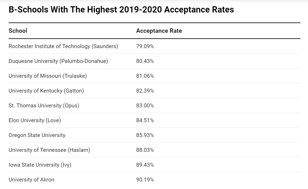 另一方面,錄取率最高的三所學校分別為:第一位是阿克倫大學商學院,錄取率最高,為90.19%;第二位愛荷華州立大學的Ivy商學院,錄取率為89.43%;第三位田納西大學Haslam商學院,錄取率為88.03%。