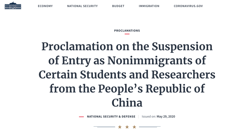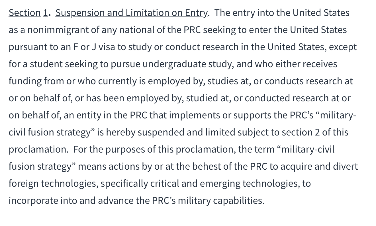 who either receives funding from or who currently is employed by, studies at, or conducts research at or on behalf of, or has been employed by, studied at, or conducted research at or on behalf of, an entity in the PRC that implements or supports the PRC’s “military-civil fusion strategy” is hereby suspended and limited subject to section 2 of this proclamation.