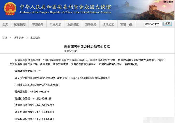 據中國駐美國大使館官網,當前美國疫情形勢嚴峻,1月6日華盛頓特區發生大規模示威游行,當地政府緊急宣布宵禁。中國駐美國大使館提醒在美中國公民密切關注當地疫情和安全形勢,提高警惕,注意安全防范,慎重考慮前往公眾場所。如遇危險或突發情況,請及時報警。
