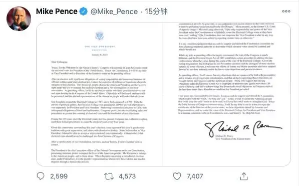 但彭斯最后在推特上發表聲明,正式拒絕了特朗普推翻拜登選舉的呼吁,并明確表示:他不認為像特朗普所說的那樣,副總統有權力否決候選人的部分選舉團票。