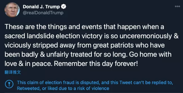 特朗普說:“這些都是當神圣的壓倒性選舉勝利(指特朗普認為自己在總統大選中獲勝),被毫不客氣地、惡毒地從偉大的愛國者手中剝奪時發生的事。他們已經被長時間不公正地對待了。大家要充滿愛與和平地回家。請永遠記住這一天!”