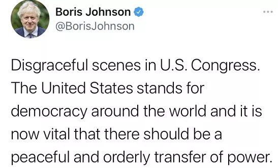 英國首相約翰遜在社交媒體上稱:"美國國會的可恥場面。美國在世界各地主張民主,現在至關重要的是實現和平有序的權力交接。"