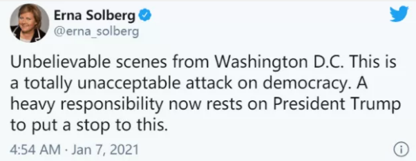 美國有線電視新聞網(CNN)消息稱,挪威首相索爾貝格在社交媒體上對美國局勢表示:“華盛頓特區的場面令人難以置信,這是對民主完全不可接受的攻擊。現在,制止這一情況的重任落在了特朗普總統身上。”