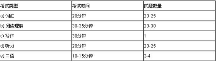考試題目包括詞匯、閱讀理解、寫(xiě)作、聽(tīng)力和口語(yǔ)。