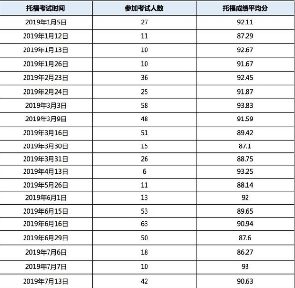 從上表可知,2019年3月3日這天不僅參加考試的人數(shù)多,同時(shí)也是平均出分最高的一天。而2月末到3月初的幾場(chǎng)考試也都是人數(shù)多且高分集中期。除此之外,5月末6月初也有很多同學(xué)參加了托??荚?,并取得了比較理想的分?jǐn)?shù)。