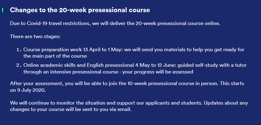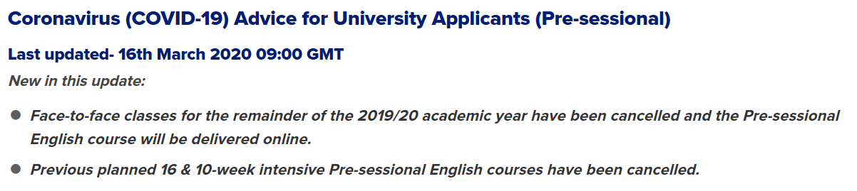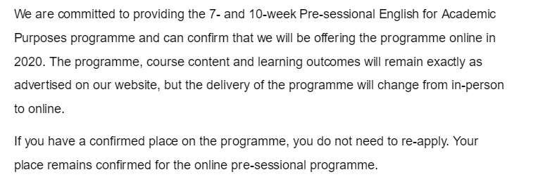 已被 18 周課程錄取尚未到校的學生將會被自動并入 14 周語言課,語言中心會在系統中將你的錄取修改為 14 周,需重新接受新錄取。14 周/10 周/5 周課程將按原定開課日期開始網上課程。將可以接受用普通雅思、UKVI雅思、PTE和托福成績申請。入讀不需要申請簽證。線上語言課最終會通過內部考核的形式進行,與原線下課程考評方式一致。順利完成考核后無需再考雅思。