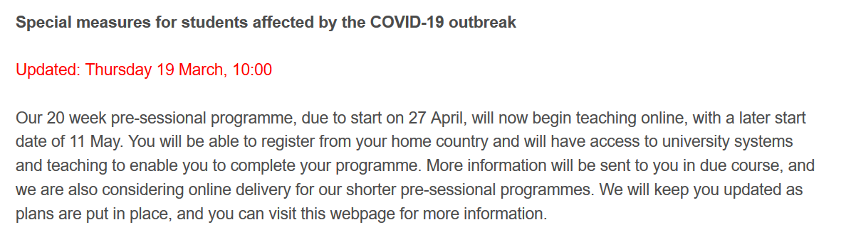 自4月14日(星期二)夏季學期開始起,約克大學所有教學活動將轉移到線上進行,20周,15周和10周的學前語言課程將以線上教學形式進行。允許使用非UKVI雅思成績來申請學前語言課程。學校也將在滿足英語語言條件方面引入更大的靈活性,決定將本科學位和研究生碩士學位的英語語言要求(雅思或同等水平)降低0.5分,為所有申請人提供更大的靈活性。 但語言要求不得降低到允許的UKVI最低水平以下(總分和個單項成績均不低于5.5)。學生入學后,學校還將高度增加學期內(in-sessional)英語課程支持,詳情需根據個人情況咨詢學校。