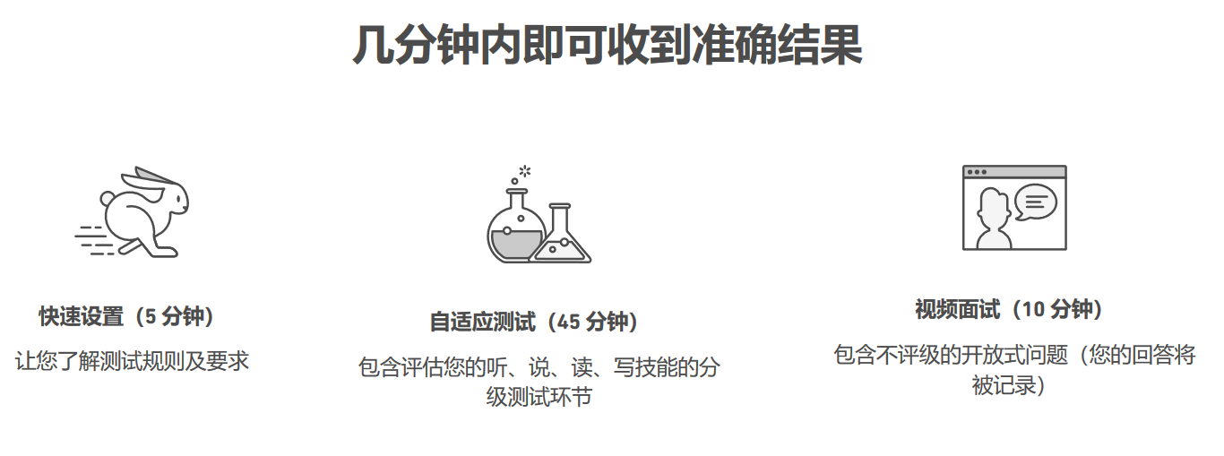 DuolingoEnglishTest是一項面向當今國際學生和機構的現代英語水平評估測試。測試可根據需要在線提供,只需49美元。您可以通過電腦和網絡攝像頭在家進行測試,而無需預約或前往考試中心參加測試,測試使用計算機自適應技術,讓問題難度將就考生的水平。測試還包括視頻面試和寫作樣本,當您將結果與分數發送至機構時,這些樣本將同時發送至相關機構。整個測試僅需約45分鐘,并在48小時內獲得認證,并可以將結果發送至無限數量的機構。從參加認證測試的完成日期開始計算,最多能在每30天內收到兩次測試的認證結果。