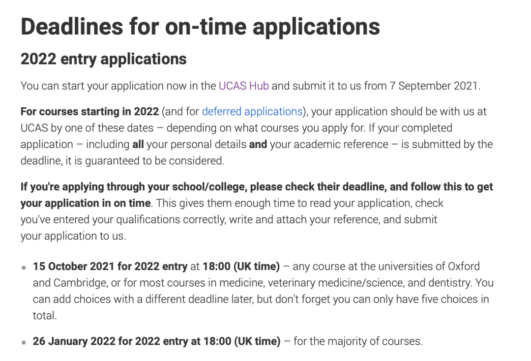 另外依然是由于疫情的影響,今年除牛津劍橋以及醫學類外依然是在10月15日進行申請,其他課程的申請截止日期長到了2022年1月26日。